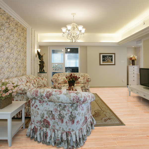 材質:歐式風格家具、條紋沙發與優雅的、具有大型花紋圖案的橡木地板相搭配,演繹自然的田園風格。